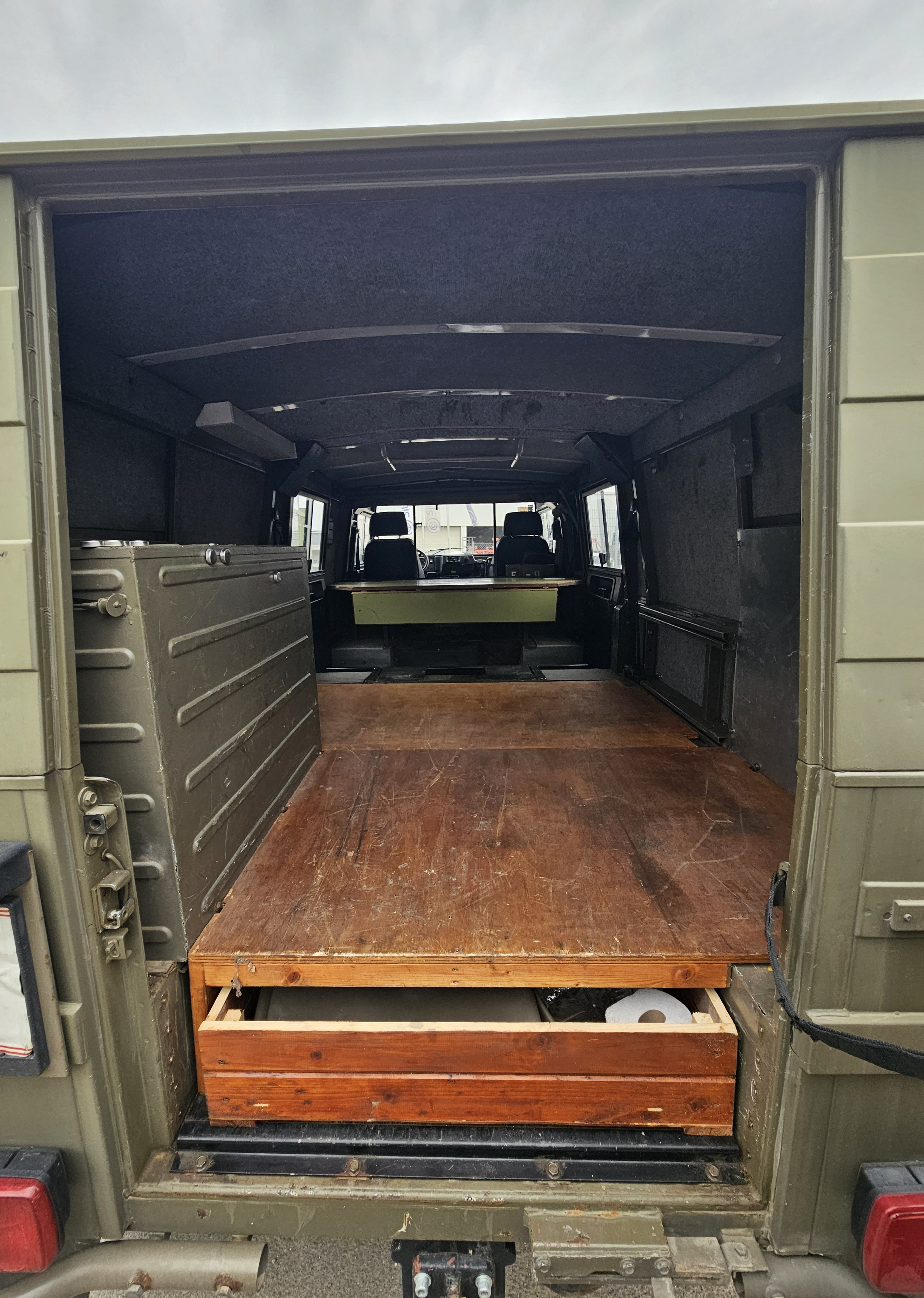 Die hinteren Sitze sind vorhanden, diese wurden ausgebaut um im Fahrzeug schlafen zu können.